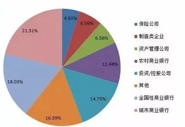 在所有金融租賃公司的控股股東和主要(前兩大)股東中,城市商業(yè)銀行占21.31%、全國性商業(yè)銀行占18.03%、農(nóng)村商業(yè)銀行占11.48%、投資/控股公司占14.75%。需要說明的是,該比例是按照股東的數(shù)量計算,并非按照投資金額的權(quán)重計算,參考意義不大。