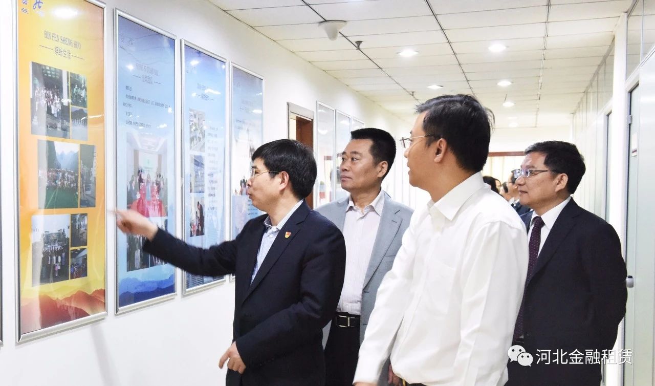 ▲河北銀監(jiān)局局長(zhǎng)李明肖(左一)、副巡視員張慶民(左二)等在河北金租董事長(zhǎng)徐敏?。ㄗ笕?、總裁王永生(左四)的陪同下觀看公司發(fā)展歷程文化墻