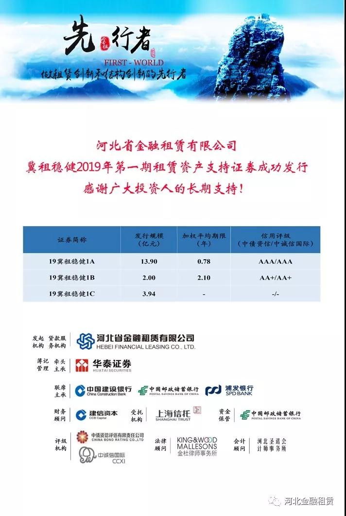 日前,河北省金融租賃有限公司(以下簡稱“河北金租”)冀租穩(wěn)健2019年第一期租賃資產(chǎn)支持證券在銀行間債券市場成功簿記建檔發(fā)行,合計金額19.84億元。