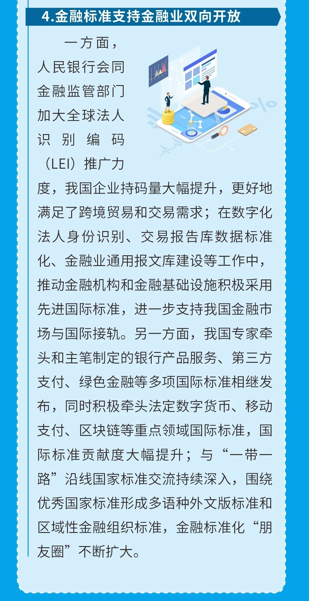 金融標(biāo)準(zhǔn)是金融業(yè)健康發(fā)展的技術(shù)支撐,是金融業(yè)治理體系和治理能力現(xiàn)代化的基礎(chǔ)性制度,中國人民銀行宣傳推廣重點(diǎn)金融標(biāo)準(zhǔn),切實(shí)做好金融從業(yè)人員及消費(fèi)者金融標(biāo)準(zhǔn)化宣教和普及工作,在行業(yè)內(nèi)營造對標(biāo)達(dá)標(biāo)的良好氛圍,引導(dǎo)消費(fèi)者使用達(dá)標(biāo)服務(wù)與產(chǎn)品,進(jìn)一步維護(hù)消費(fèi)者合法權(quán)益。